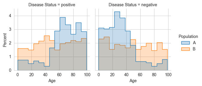 In particular, the similarity of the the Age distributions between the subpopulations defined by Disease Status (first row of the table) seem quite low.