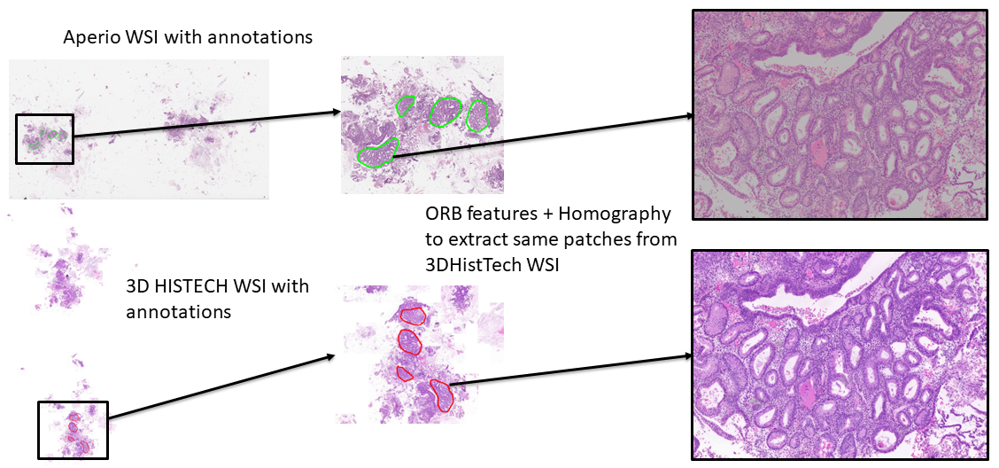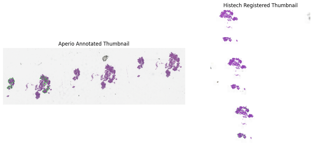 This module enables tissue registration and annotation transfer between Whole Slide Images (WSIs) scanned by different devices (e.g., Aperio and Histech). It uses ORB-based image registration and homography mapping to align annotations and extract corresponding regions.